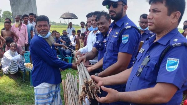 সংঘর্ষে না জড়ানোর প্রতিশ্রুতিতে পুলিশের কাছে দেশীয় অস্ত্র তুলে দিলো গ্রামবাসী