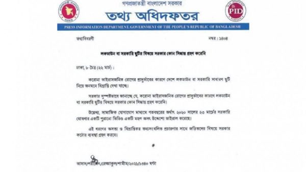 সাধারণ ছুটি বা লকডাউনের কোন সিদ্ধান্ত নেয়নি সরকার