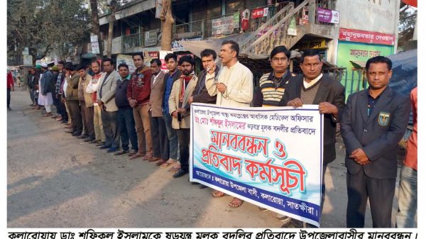 কলারোয়া হাসপাতালের ডাঃ শফিকুল ইসলামের বদলির প্রতিবাদে মানববন্ধন ও প্রতিবাদ সমাবেশ