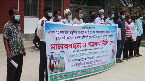 নওগাঁয় সরকারী ভর্তূকীর আওতায় প্রদত্ত কম্বাইন্ড হার্ভেষ্টার ক্রেতাদের মানববন্ধন কমসূচী